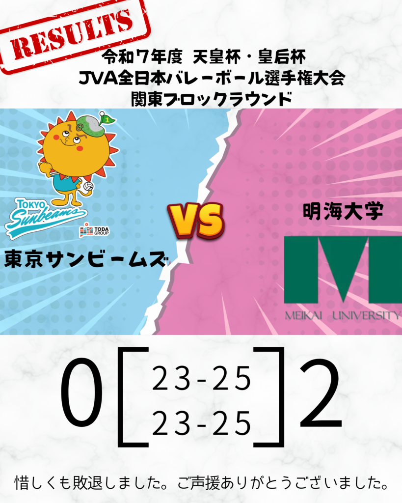 東京サンビームズは、千葉県代表の明海大学と対戦し、惜しくも敗退となりました。 たくさんのご声援ありがとうございました。