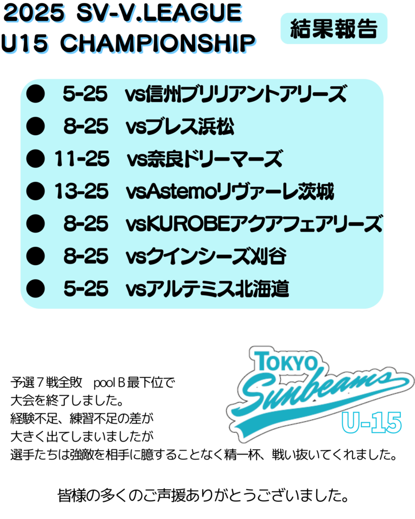 東京サンビームズジュニアU-15チームが【2025 SV-V.LEAGUE U15 CHAMPIONSHIP】に参戦してきました。 Uー15チームとして初陣でしたが、結果は7戦全敗で大会を終えました。