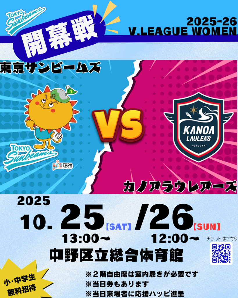 東京サンビームの開幕戦は10月25日(土)・26日(日) vs カノアラウレアーズ福岡 @中野区立総合体育館