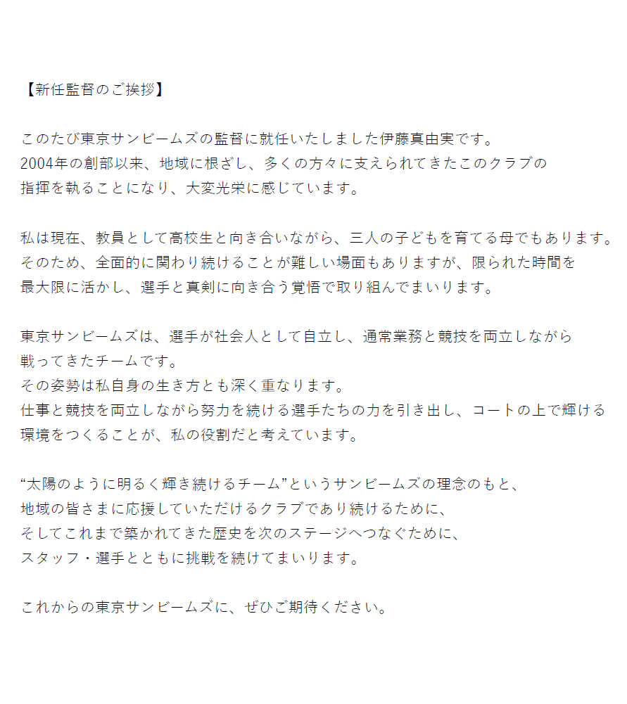 このたび、東京サンビームズの監督が交代することとなりましたのでご報告申し上げます。