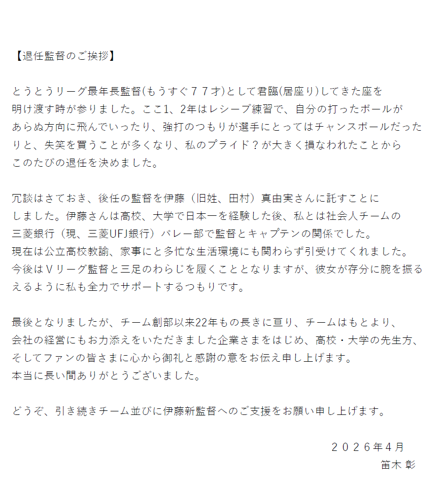 笛木彰監督にはこれまでチームをけん引いただき、多くの経験と成長の機会をもたらしていただきました。これまでのご尽力に心より感謝申し上げます。