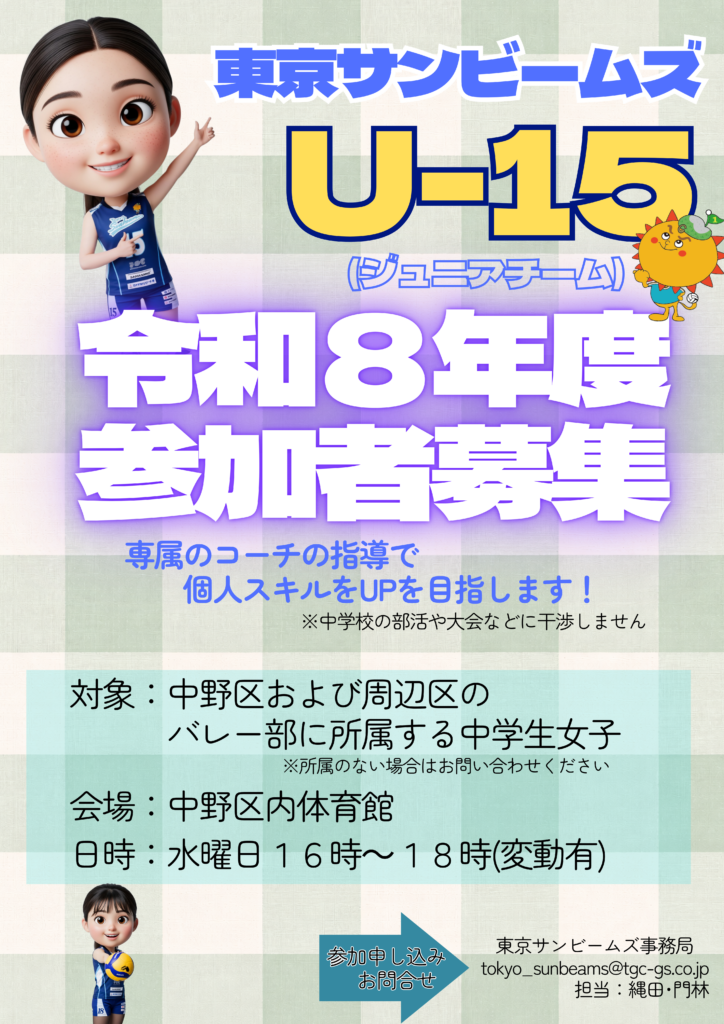 【東京サンビームズU-15参加者募集のご案内】 Uー15メンバー募集!